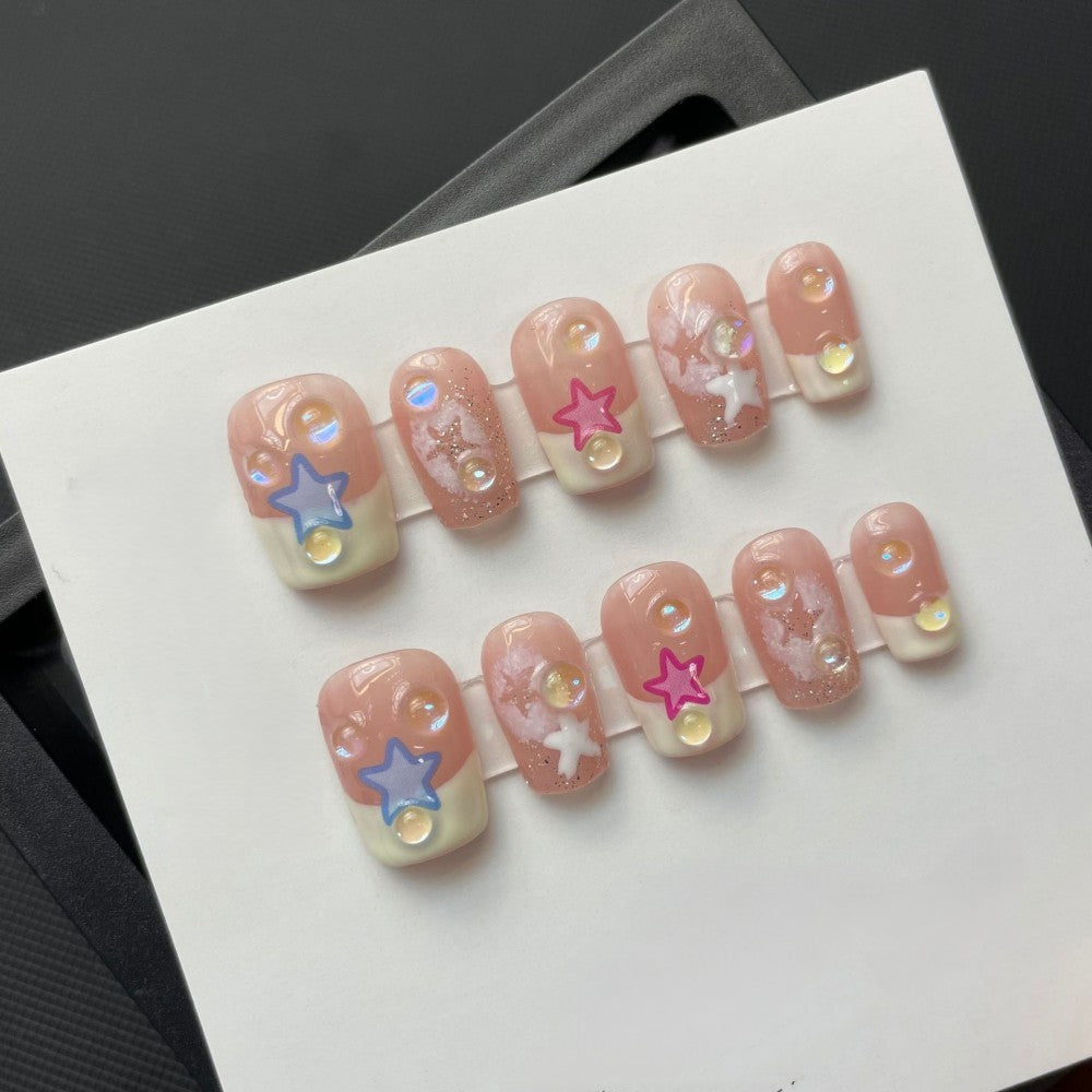 Plongez dans l’univers doux et ludique de Sweet Star Ladder, un modèle rose pastel décoré d’étoiles colorées, de petites perles et d’un fini glossy irrésistible. Un design frais, mignon et plein de lumière: parfait pour celles qui aiment les manucures girly, fun et pétillantes, sans jamais perdre en élégance.